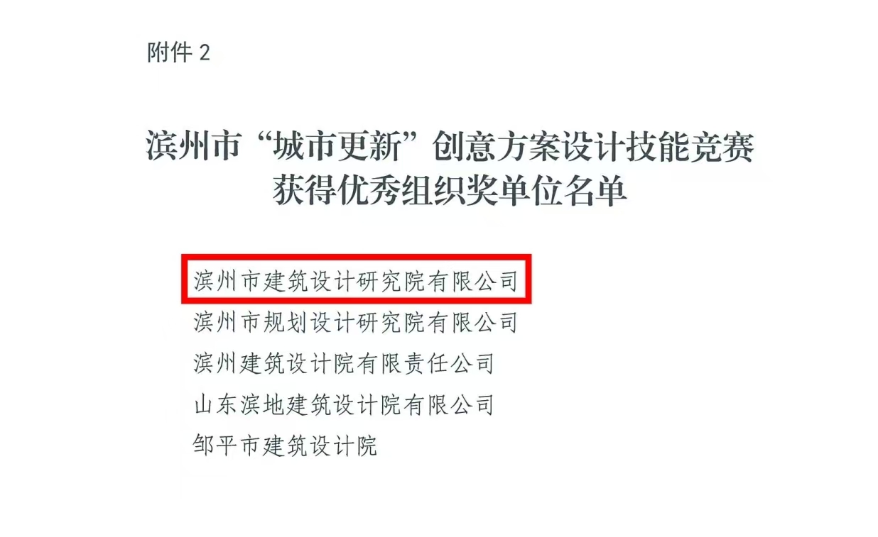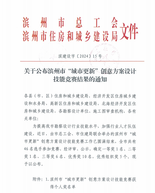 2024年10月,在濱州市總工會(huì)、濱州市住房和城鄉(xiāng)建設(shè)局共同主辦,濱州市勘察設(shè)計(jì)協(xié)會(huì)、濱州建筑工程施工圖審查中心承辦的濱州市“城市更新”創(chuàng)意方案設(shè)計(jì)技能競(jìng)賽中,公司員工憑借出色的創(chuàng)意和專業(yè)的技能脫穎而出,參賽的9名員工全部獲獎(jiǎng),囊括一、二等獎(jiǎng),另外3人獲三等獎(jiǎng),4人獲優(yōu)秀獎(jiǎng),公司獲得優(yōu)秀組織獎(jiǎng)。本次競(jìng)賽活動(dòng)主題為“聚力創(chuàng)新發(fā)展,賦能強(qiáng)市建設(shè)—濱州市城市更新設(shè)計(jì)探索”。